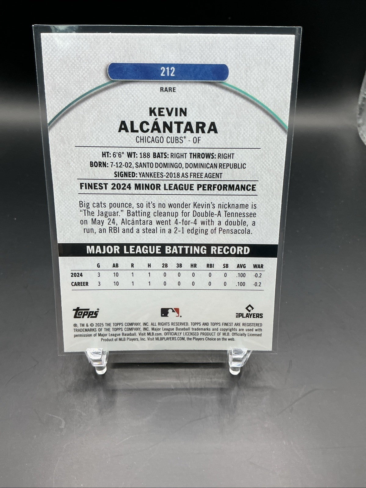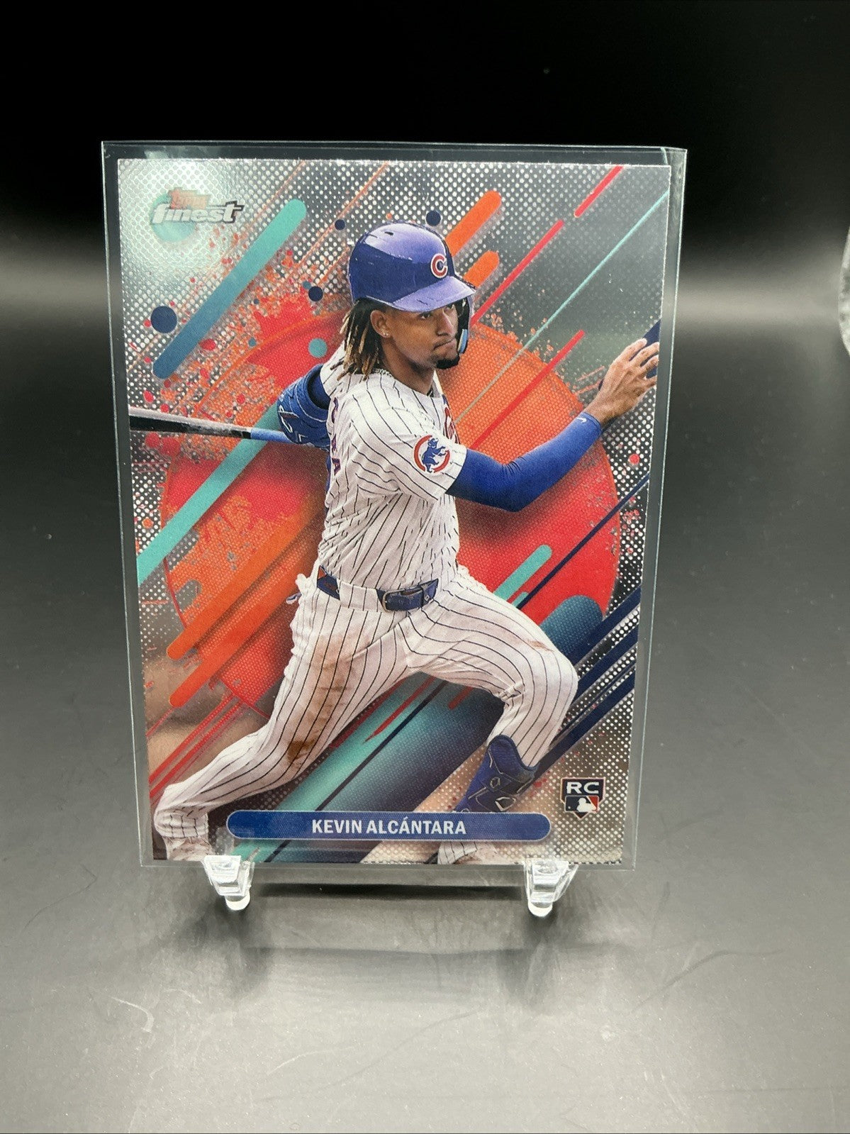 The product is a rare 2025 Topps Finest Kevin Alcantara trading card featuring the Chicago Cubs rookie player. This original card is made of card stock with a thickness of 20 Pt., and it is part of the Major League Baseball league. The card is autographed with a label or sticker by the player, and it is authenticated by Topps. It is a standard-sized card and is in English, making it a sought-after collectible for baseball fans and trading card enthusiasts.