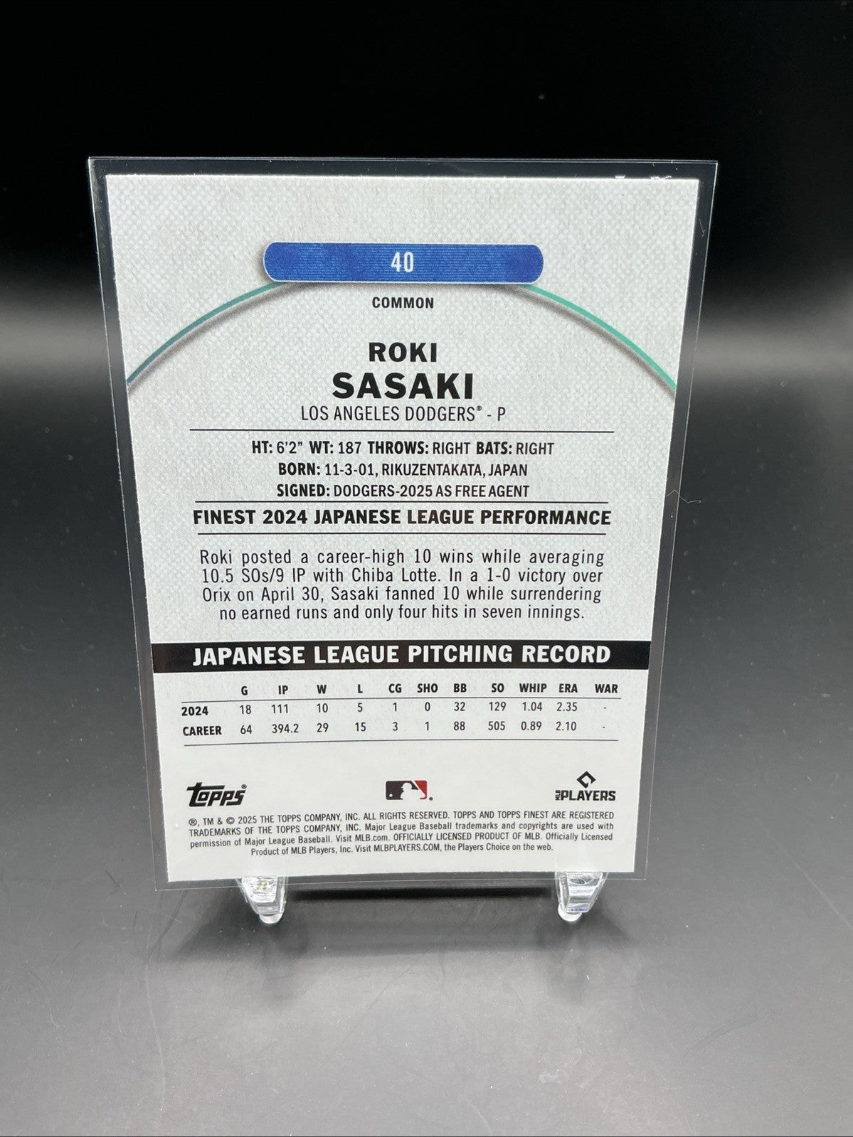 The 2025 Topps Finest Roki Sasaki #40 trading card is a common card featuring the baseball player Roki Sasaki from the Los Angeles Dodgers. Manufactured by Topps, this sports trading card is part of the 2025 Topps Finest set. With a card number of 40 and representing Sasaki as the player, this collectible item is perfect for fans of baseball and trading cards.