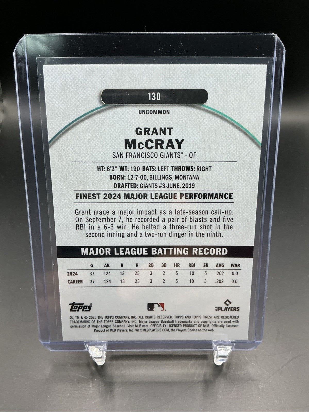 The 2025 Topps Finest Uncommon Grant McCray RC Checkerboard Refractor #130 trading card features a standard-sized baseball card made of card stock. This original card from Topps Finest showcases Grant McCray of the San Francisco Giants, making it a valuable addition to any sports trading card collection. The checkerboard design adds a unique touch to this English-language card, which is part of the Major League Baseball franchise. This card is not autographed and is a single return and claims feature within the set.