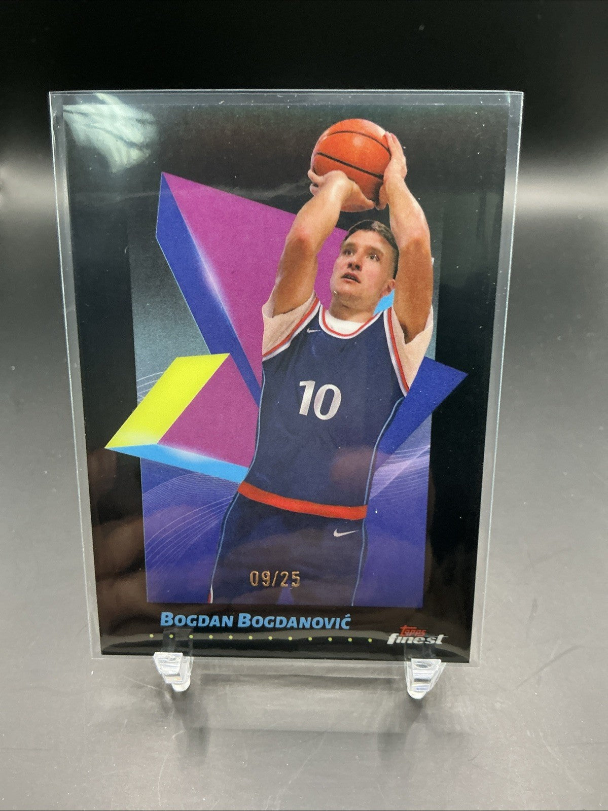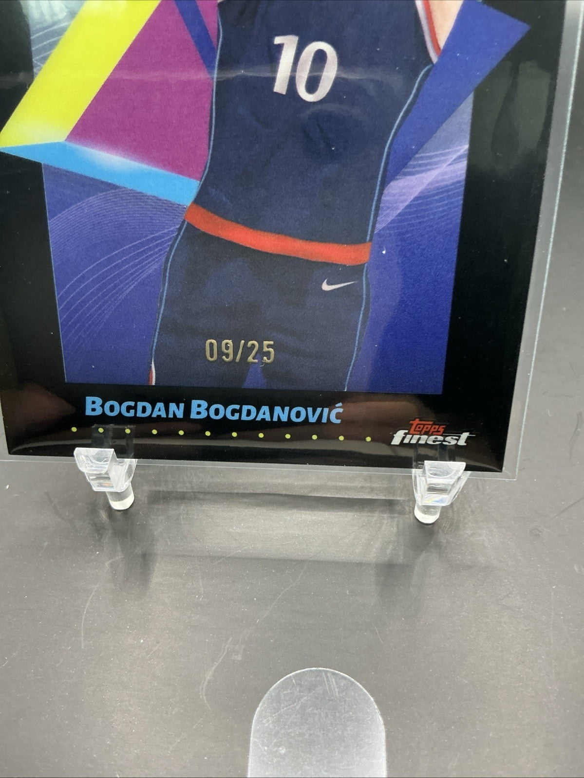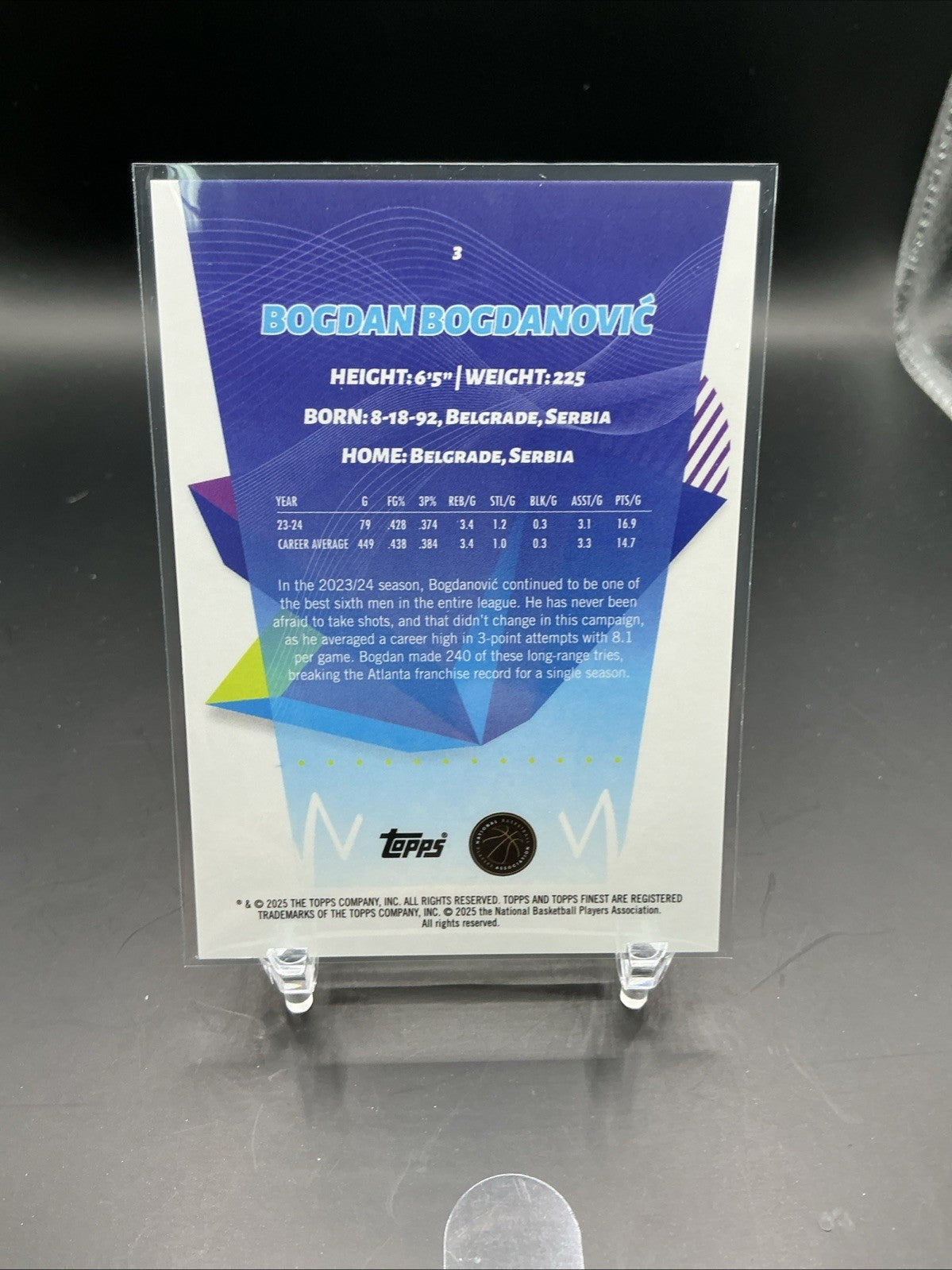 The product is a 2024-25 Topps Finest #3 Black Refractor 9/25 SSP trading card featuring basketball player Bogdan Bogdanovic. This original sports trading card measures 5" x 3¾" and is a part of the Topps Finest set. The card is not autographed and is a rare parallel variety, making it a valuable collectible for fans of basketball trading cards.