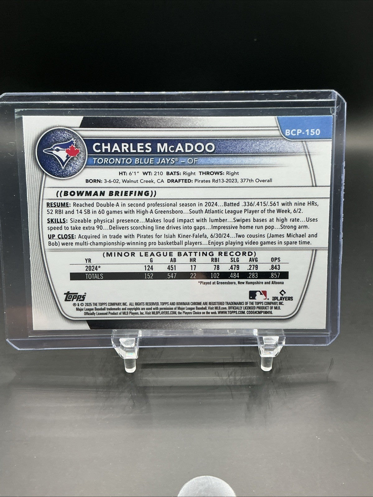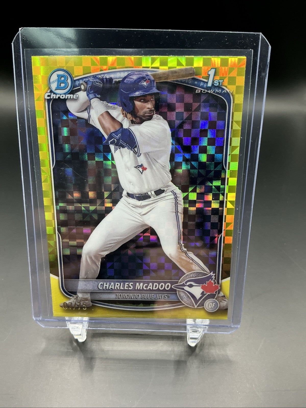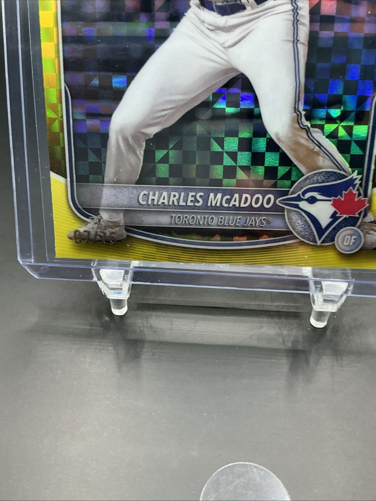 The product is a 2025 Bowman Chrome 1st Yellow X-Fractor trading card featuring baseball player Charles McAdoo from the Blue Jays team. This original card is serial numbered and measures 3½" x 2½". It is a rare collectible item with only 75 copies produced, making it a valuable addition to any sports trading card collection.