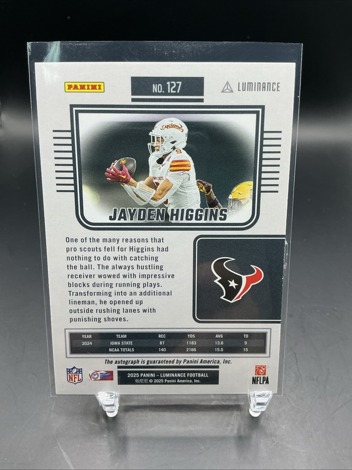 The product is a 2025 Panini Luminance trading card featuring an autograph from Jayden Higgins, a rookie player for the Houston Texans in the National Football League (NFL). The card is numbered #127 out of a print run of 700 and includes a blue parallel variety. It is authenticated by Panini Authentic and made of card stock and metal materials. This original sports trading card is a valuable addition for collectors and fans of football memorabilia.