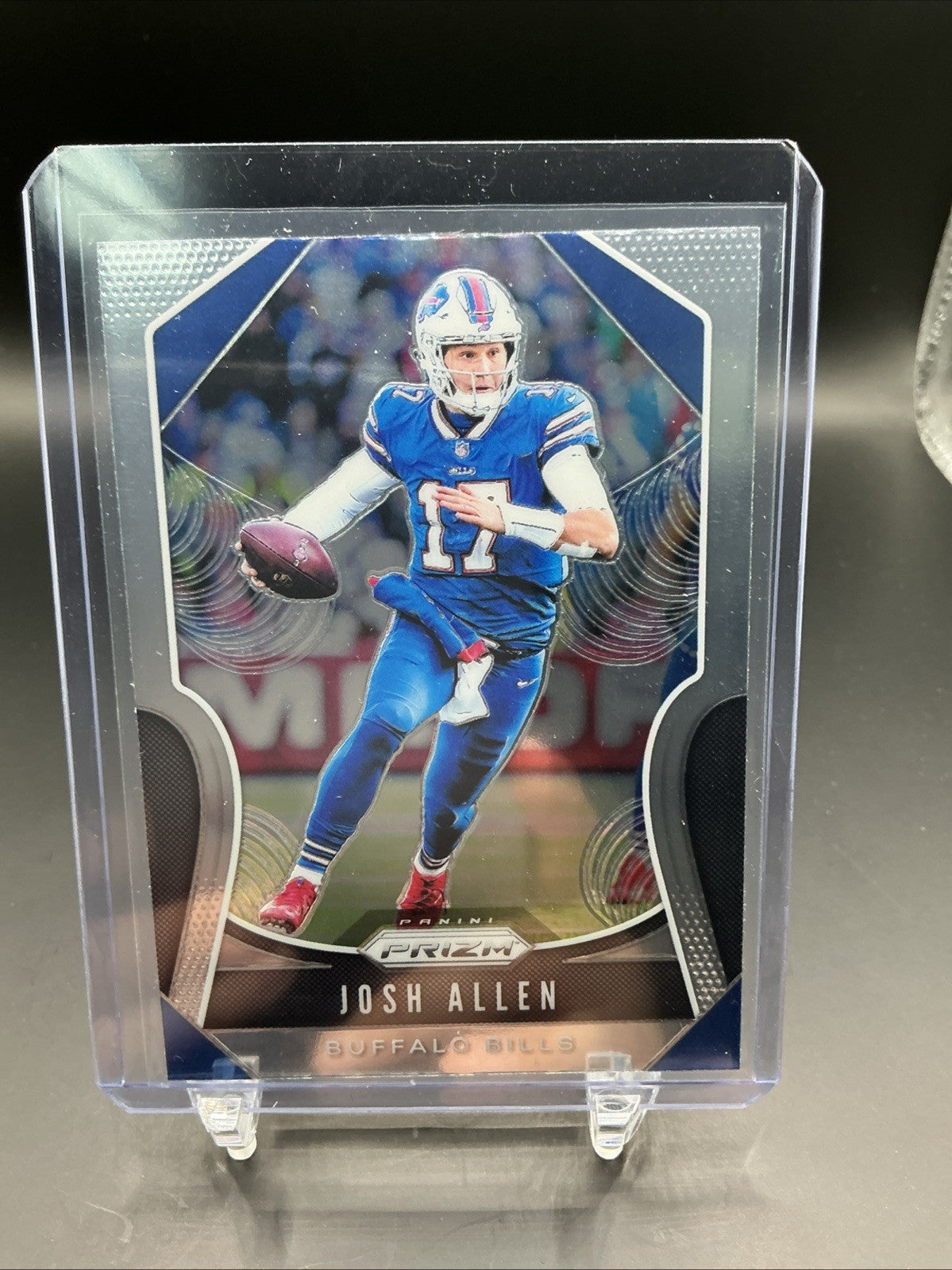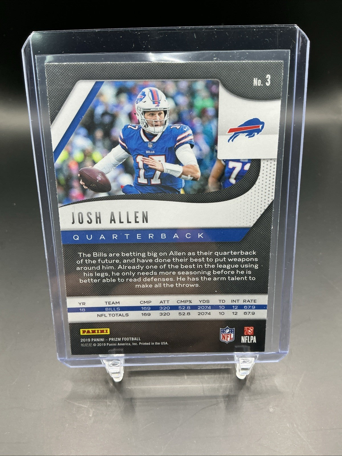 The product is a 2019 Panini Prizm base 2nd year trading card featuring Buffalo Bills player Josh Allen. This original card, made of card stock, is part of the base set for the National Football League (NFL) season. It is a standard-sized sports trading card manufactured by Panini, with the card number being #3. This collectible item is a great addition for football fans and trading card enthusiasts looking to add a piece of memorabilia from the 2019 season to their collection.