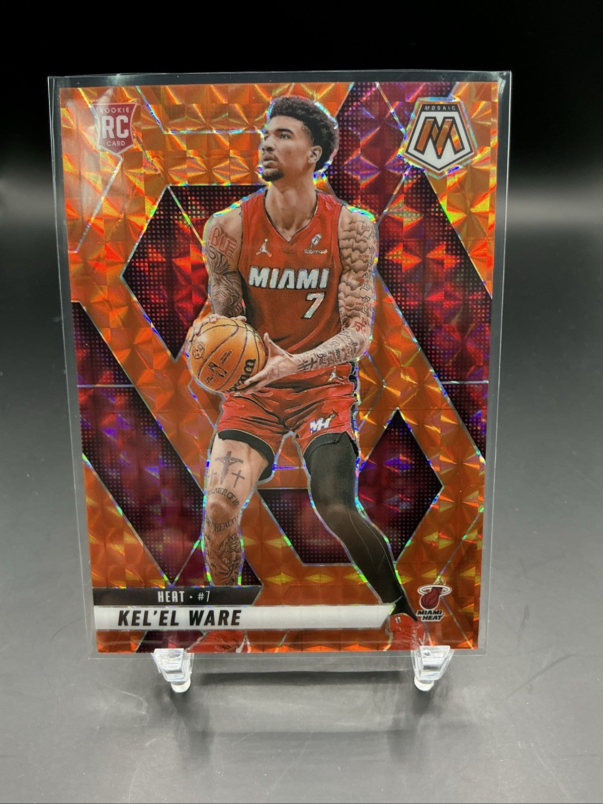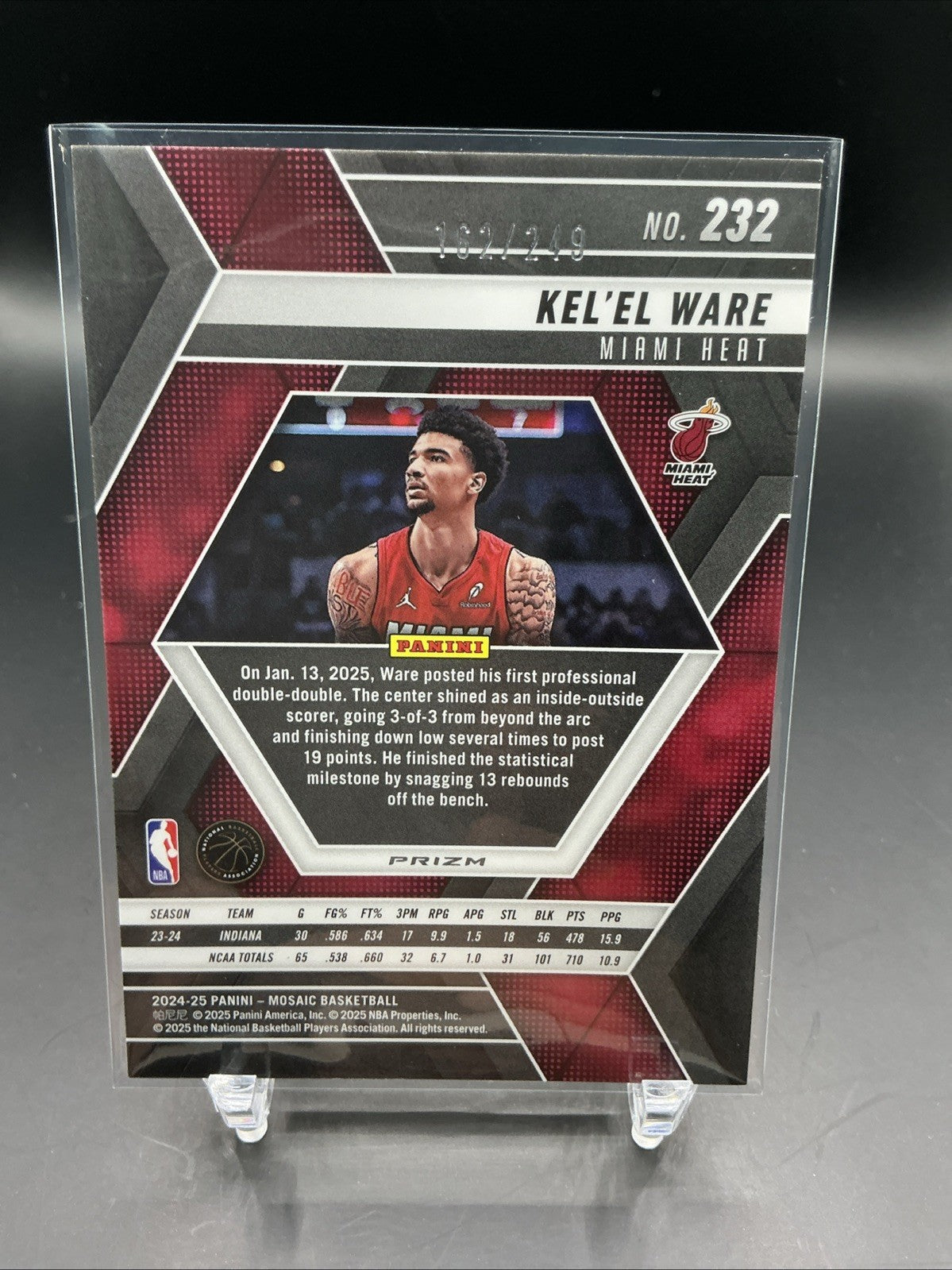 The product is a 2024-25 Panini Mosaic Orange Mosaic Prizm #232 SP RC trading card featuring Kel'el Ware. This basketball card is a rare short print, limited to just 249 copies, making it highly sought after by collectors. With the reputable Panini manufacturer and quality Mosaic Prizm parallel, this card is sure to be a prized addition to any sports trading card collection.