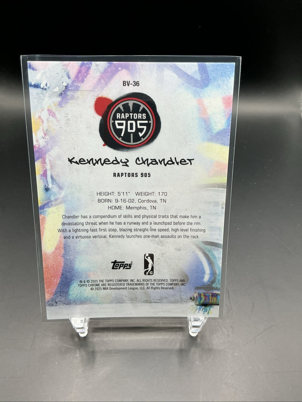 The product is a KENNEDY CHANDLER 2024-25 Topps G League Chrome Pink #BV-36 trading card featuring the basketball player Kennedy Chandler. This original card manufactured by Topps showcases the player in his Raptors team, with a limited print run of only 25 cards. Measuring at 4½" x 3½", this sports trading card is a collectible item for fans of basketball and the G League.
