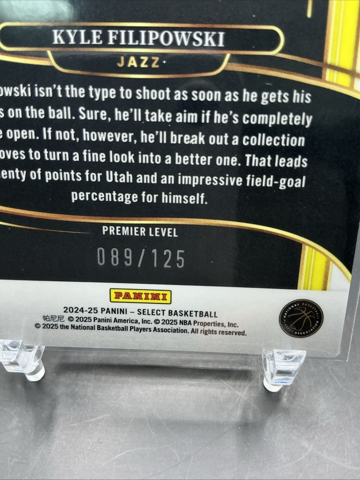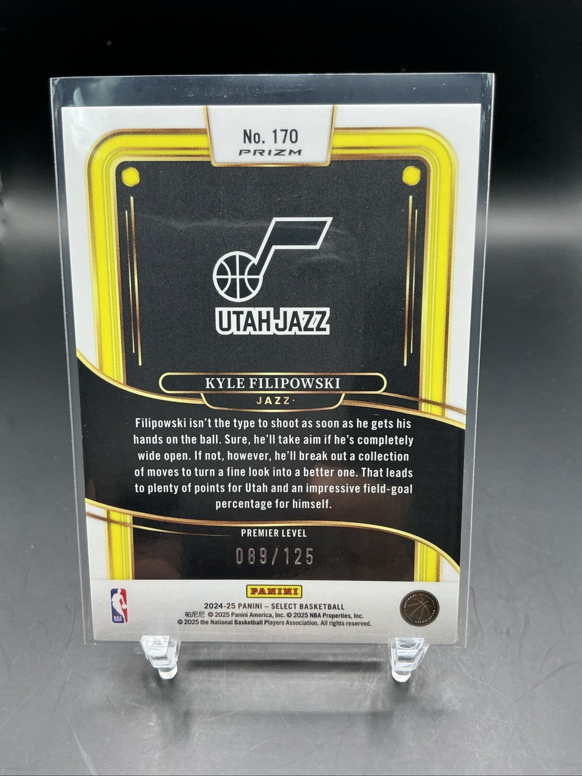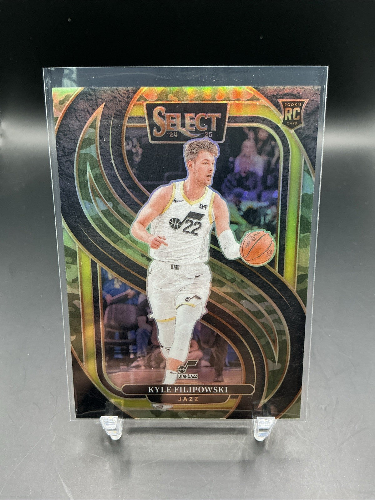 The product is a Kyle Filipowski 2024 Panini Select Camo Green Prizm #170 Rookie Premier trading card. This card features a parallel variety with a serial number, making it a short print. It is part of the base set for the 2024 Panini Select collection, specifically representing the Utah Jazz team in the National Basketball Association (NBA). As a rookie card, it holds value for collectors looking to add a piece of the promising player's early career to their collection.