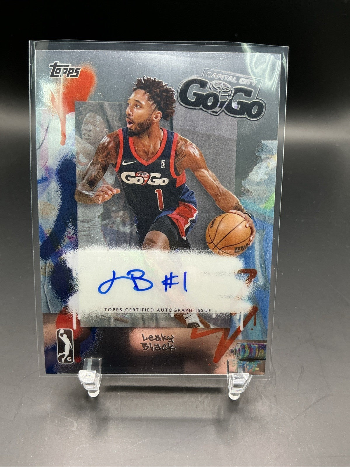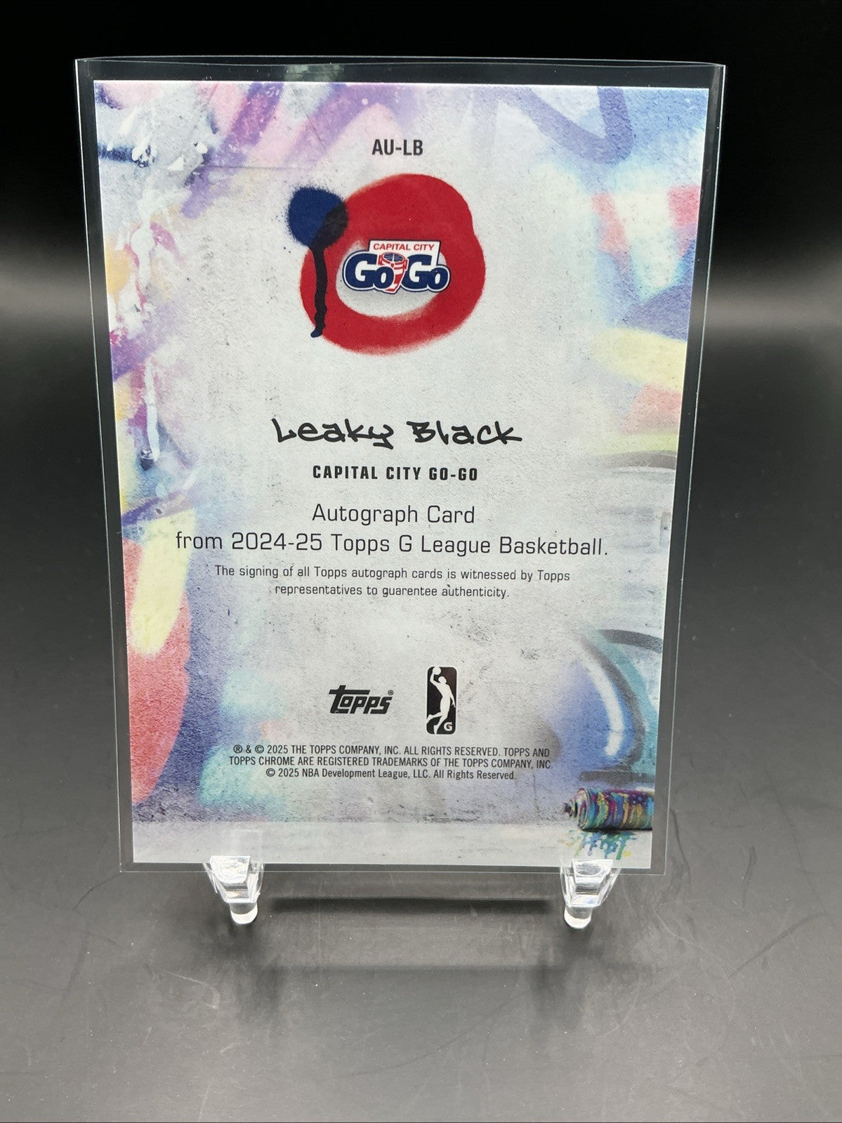 The product is a Leaky Black 2024-25 Topps Chrome G League trading card. This card features an autograph from the basketball player Leaky Black and is part of the 2024 Topps Chrome set by manufacturer Topps. It falls under the category of Sports Trading Cards and would be a sought-after collectible for fans and collectors of basketball memorabilia.