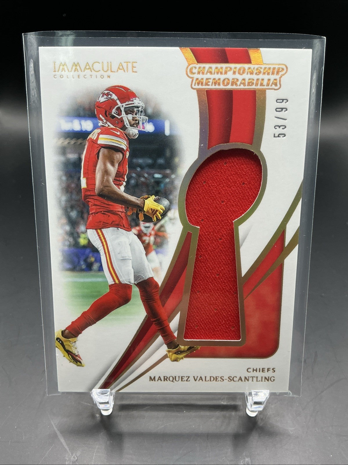 The product is a Marquez Valdes-Scantling 2024 Immaculate Championship Patch trading card, featuring a patch of the player's jersey. This original card is licensed by Football and is a limited edition, with only 99 copies produced. It is a 3½" x 2½" card that showcases the character Marquez Valdes-Scantling from the Green Bay Packers, making it a unique addition to any sports trading card collection.