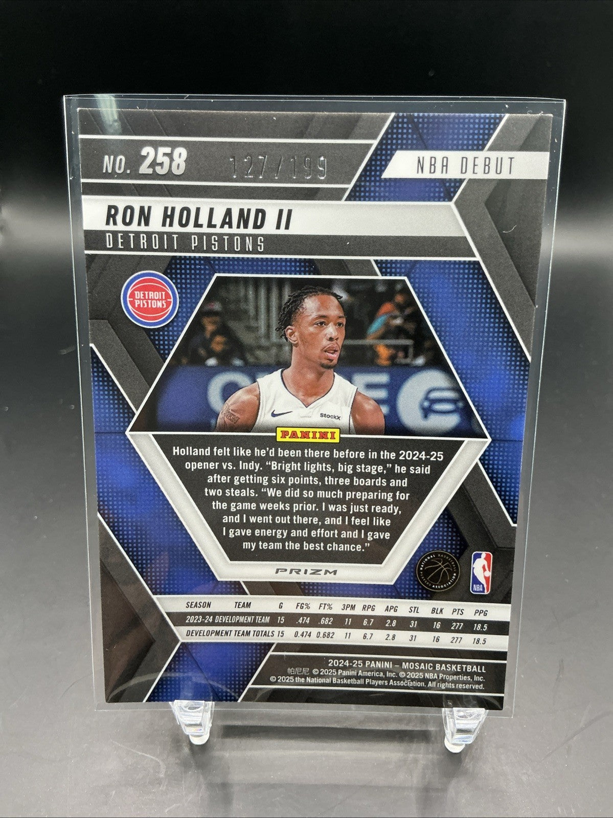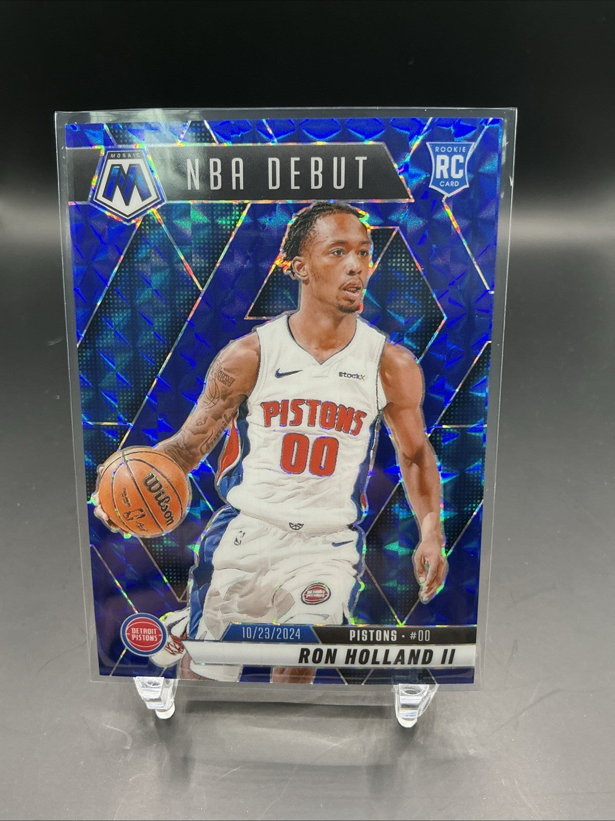 The product is a 2024-25 Panini Mosaic NBA trading card featuring Ron Holland II. This particular card is a Debut Blue Mosaic Prizm parallel, numbered out of 199. The card is a rookie card, making it a valuable collectible for fans of basketball trading cards. With the official NBA branding and the high-quality production from Panini, this card is a sought-after item for collectors looking to add a special piece to their collection.