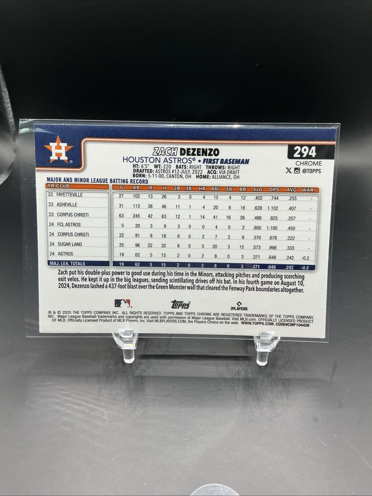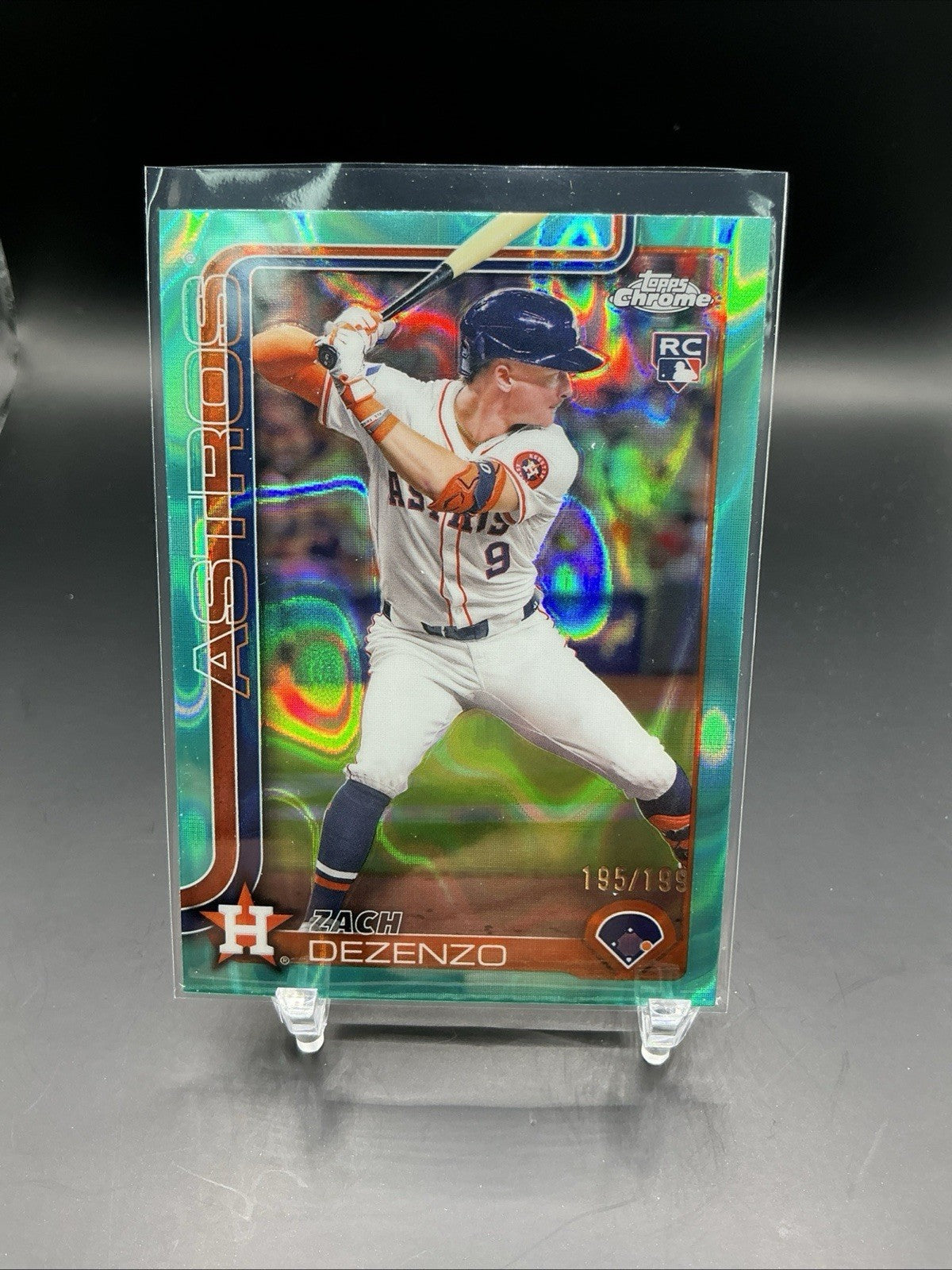 The product is a 2025 Topps Chrome Teal Wave Refractor trading card featuring baseball rookie Zach Dezenzo. This limited edition card is numbered #294 out of 199, making it a valuable addition to any sports trading card collection. With its green parallel variety and high-quality manufacturer, Topps, this card is sure to be a standout in any baseball card collection for the 2025 season.
