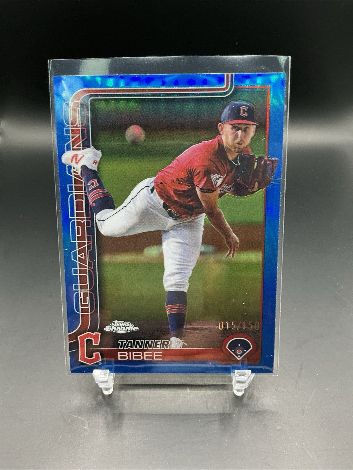 The Topps 2025 Chrome Marvel Blue Tanner Bibee Card is a limited edition trading card featuring the Major League Baseball player Tanner Bibee. This original card is part of the 2025 Topps Chrome set and has a print run of only 150, making it a rare and collectible item for baseball fans. The card is made of card stock and is serial numbered, adding to its unique appeal. The blue parallel variety adds a special touch to this MLB World Series themed sports trading card, which is sure to be a coveted piece for collectors and fans alike.