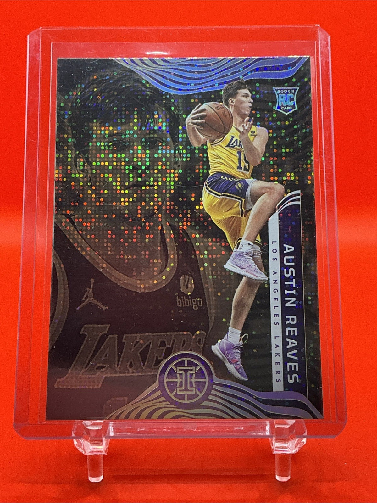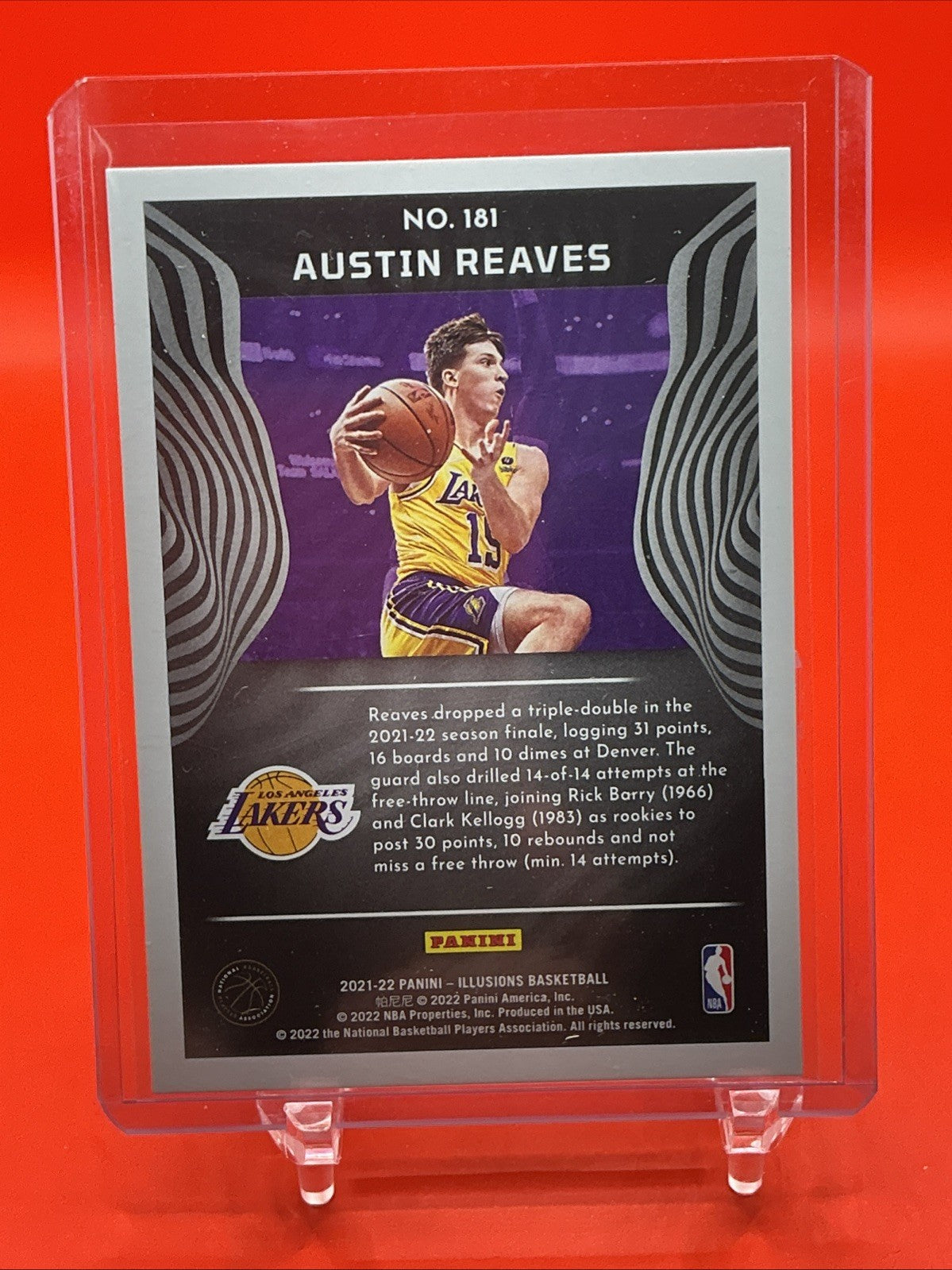The 2021-22 Panini Illusions Austin Reaves Rookie #181 Trophy Collection Bronze RC trading card features the standout player from the Los Angeles Lakers. Manufactured in 2022, this original card is made of high-quality card stock with a 35 Pt. thickness. With a unique Trophy Collection Bronze parallel variety, this limited edition card is a must-have for collectors and fans of the NBA and basketball trading cards. This card is part of the 2021-22 Panini Illusions Basketball set and showcases the rookie season of Austin Reaves, making it a valuable addition to any sports memorabilia collection.