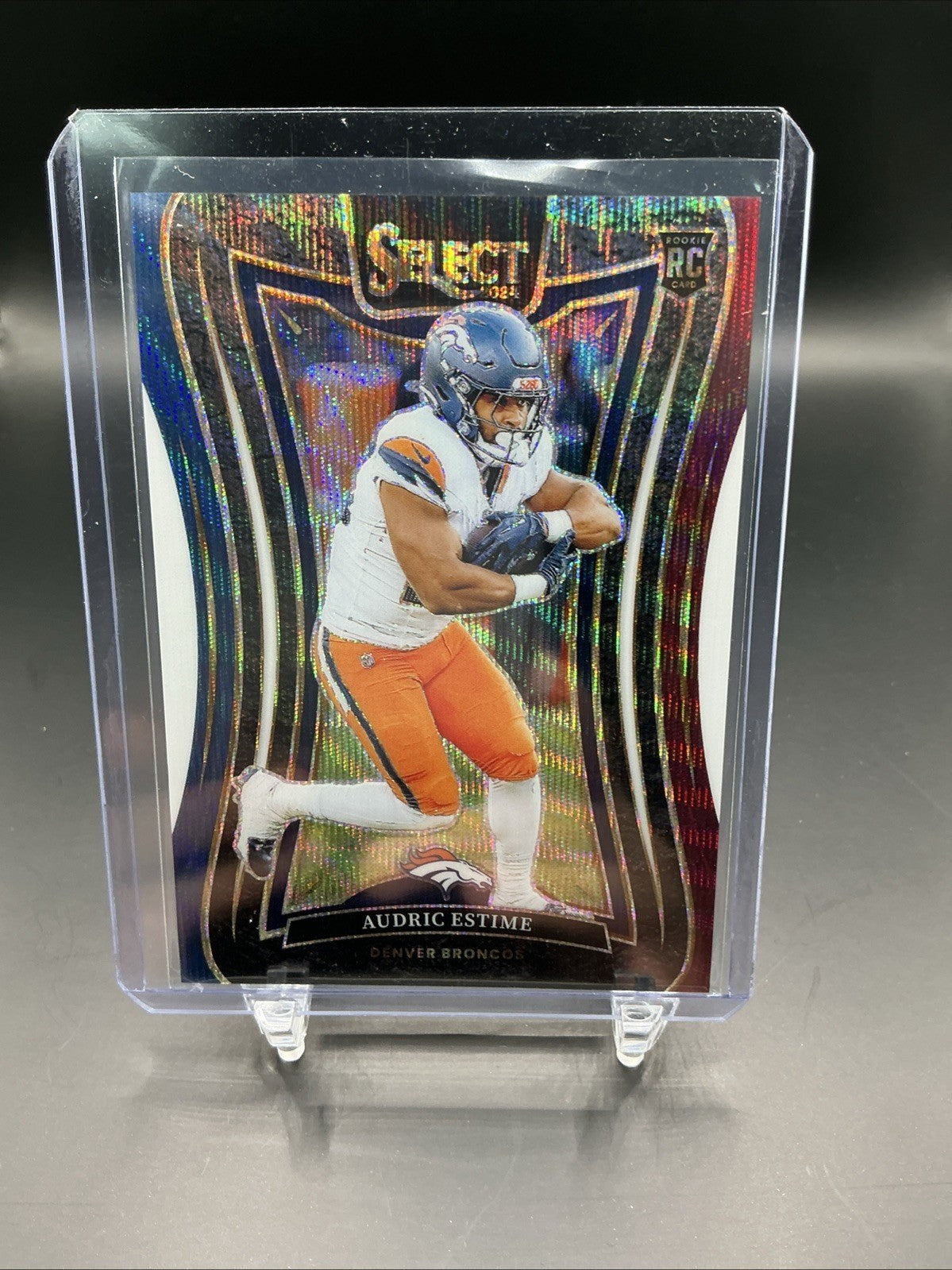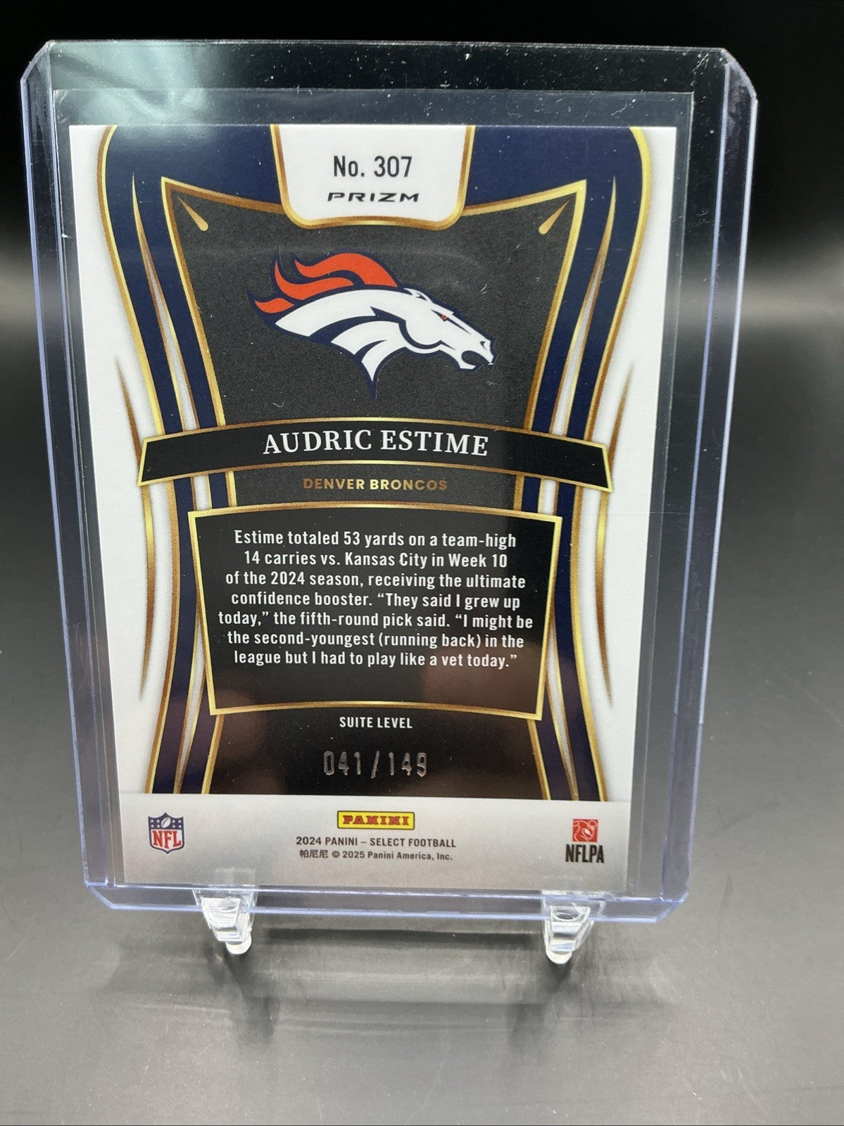 The 2024 Panini Select Audric Estime 307 Suite Level Tri-Color Prizm RC /149 trading card features a standard card size, made of 35 Pt. card stock with a tri-color Prizm parallel variety. This original rookie card from the Select set showcases the Denver Broncos player Audric Estime, part of the 2024 NFL season. Authenticated by Panini Authentic, this single card is a serial numbered collectible, making it a sought-after item for football card enthusiasts.