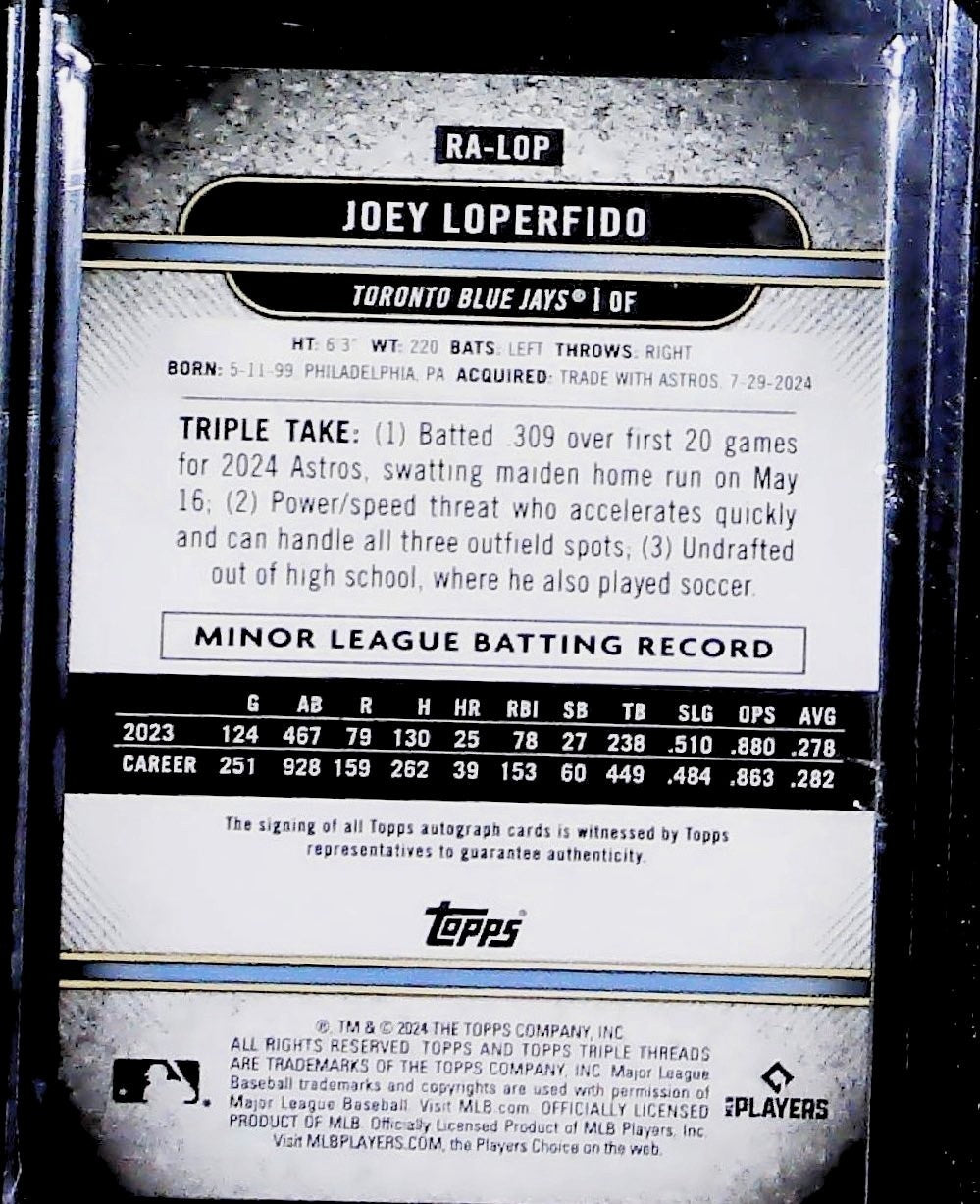 2024 Topps Triple Threads Baseball Joey Loperfido Rookie Auto /199 RC BLUE JAYS