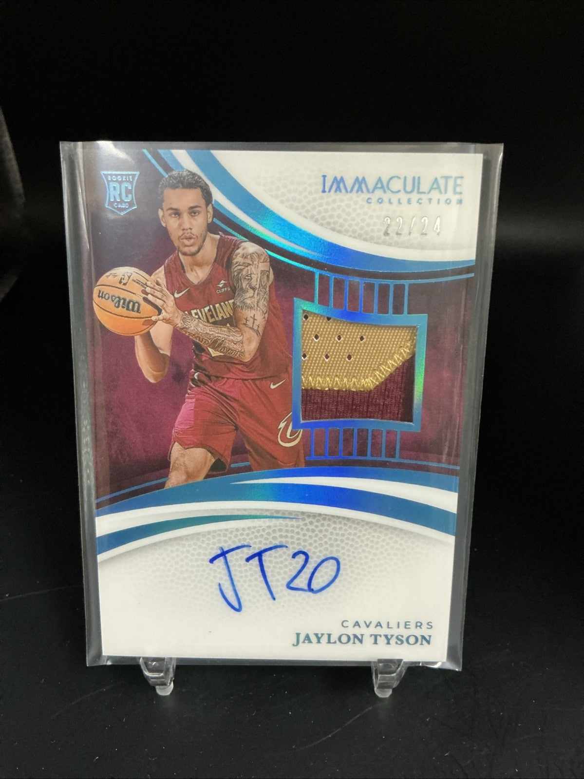 The product is a 2024-25 Immaculate Basketball Jaylon Tyson RPA card, featuring an on-card autograph and limited to just 24 copies. This original card, manufactured by Panini, showcases the young player from the Cleveland Cavaliers, making it a highly sought-after collectible for basketball fans and collectors. With its premium card stock material and unique features such as serial numbering and memorabilia, this card is a valuable addition to any sports trading card collection, especially for fans of the National Basketball Association.